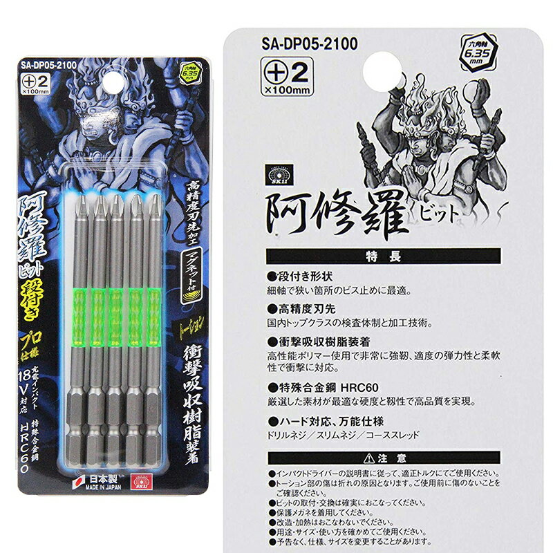 SK11 阿修羅ビット 段付き 5P SA-DP05-2100 +2×100mm マグネット付 六角軸6.35mm 5本入り メール便対応(4個まで) 4977292306836
