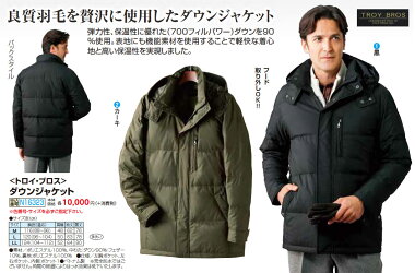※トロイ・ブロス ダウンジャケット(全2色) メンズ アウター 紳士 シニア ダウンコート ブラック カーキ フード付き カジュアル 羽毛 暖かい 良質羽毛を贅沢に使用したダウンジャケット 弾力性、保温性に優れた(700フィルパワー)ダウンを90%使用。